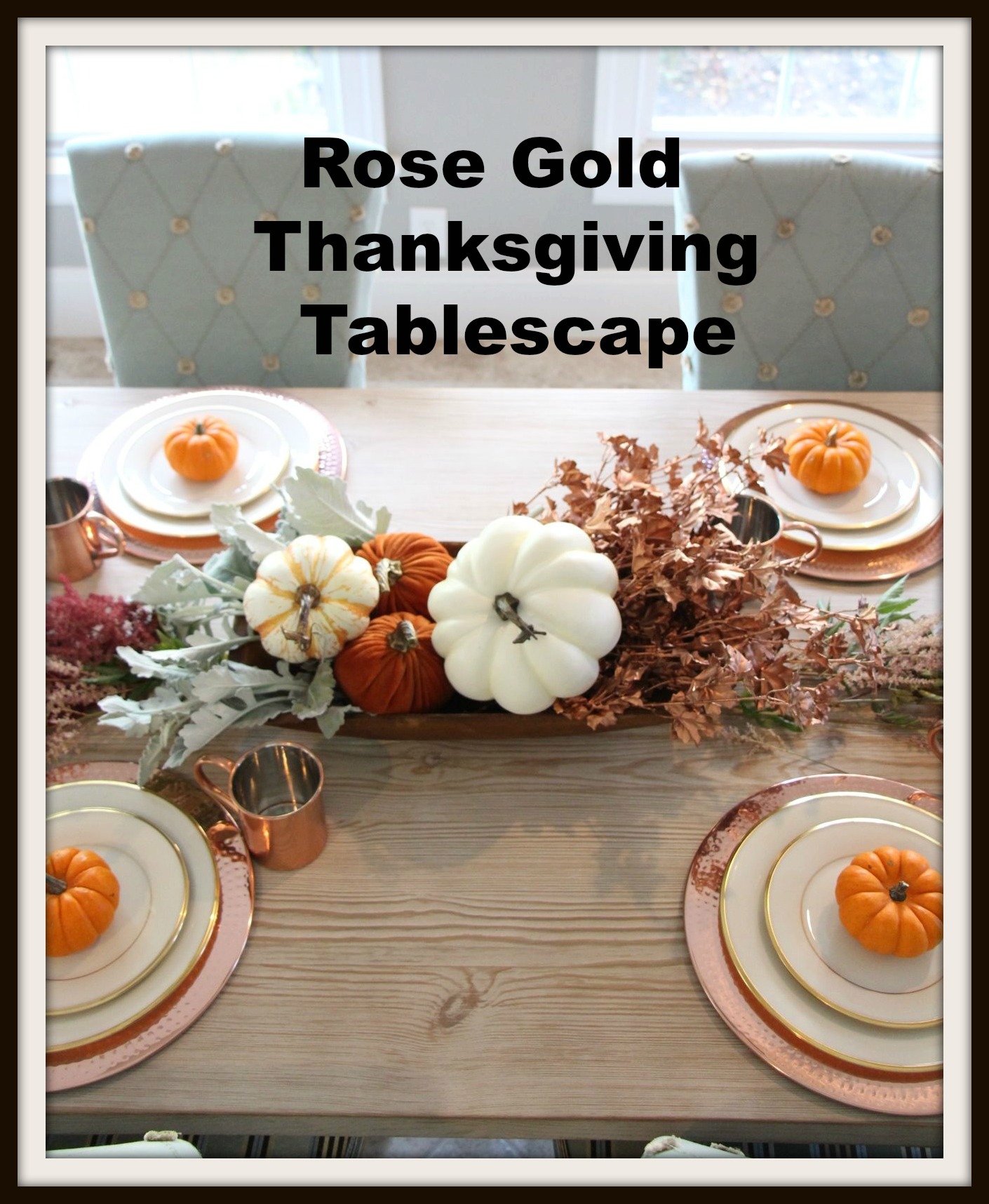 My copper mugs from Target and and Copper hammered chargers from Wayfair were key pieces to pull off this rose gold look. Â These are very inexpensive pieces that really set the tone for the look I was going for.
