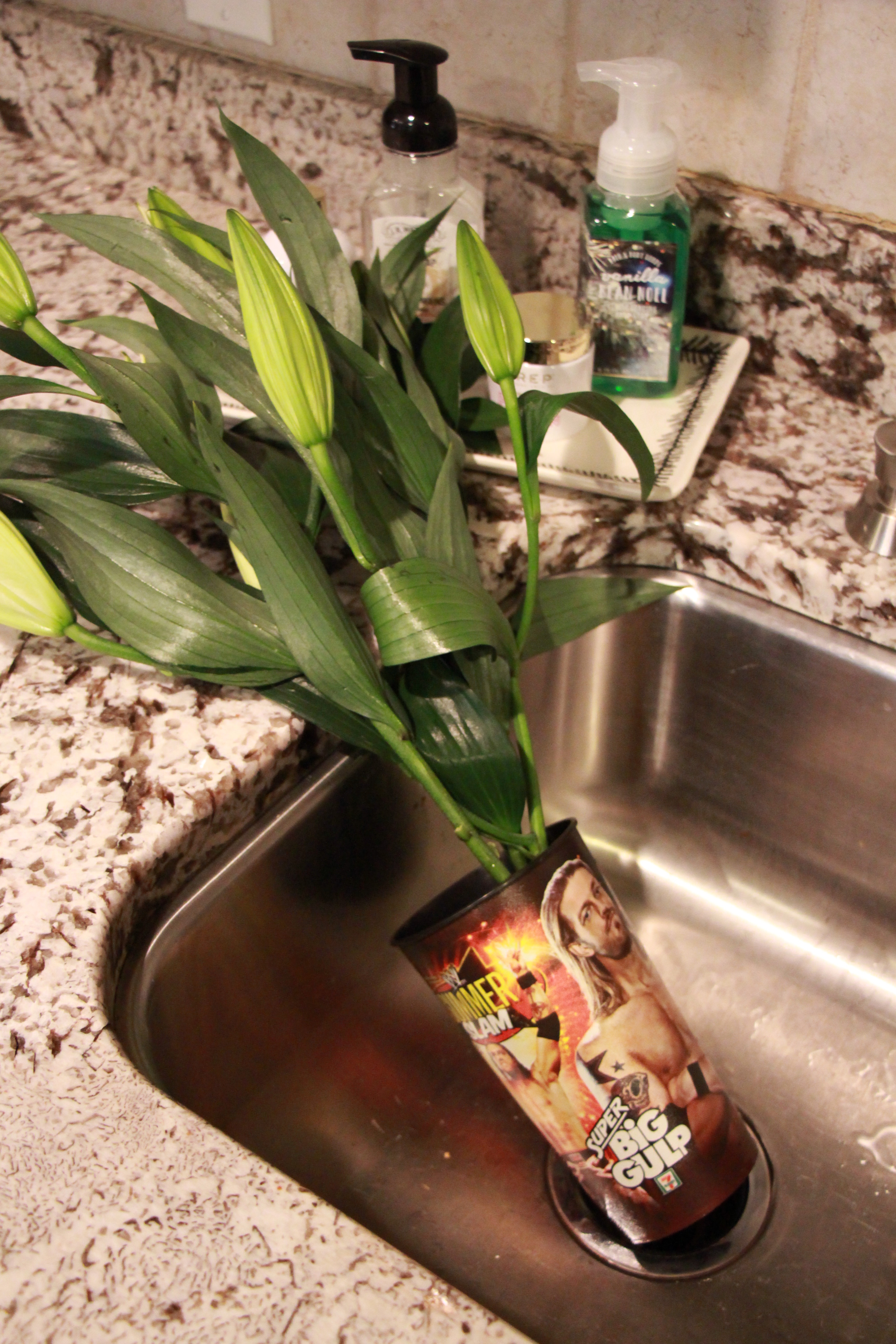 This is the “gorgeous” vase I use when I bring my flowers home. Â I put them in this 7-11 cup and store them in the sink until I’m ready to arrange them. Â I do most of my flower arrangements. Â Several of you asked where I find reasonably priced flowers. Â I usually get my flowers at Trader Joe’s. Â Norfolk Wholesale also has a great selection and Whole Foods has great prices.