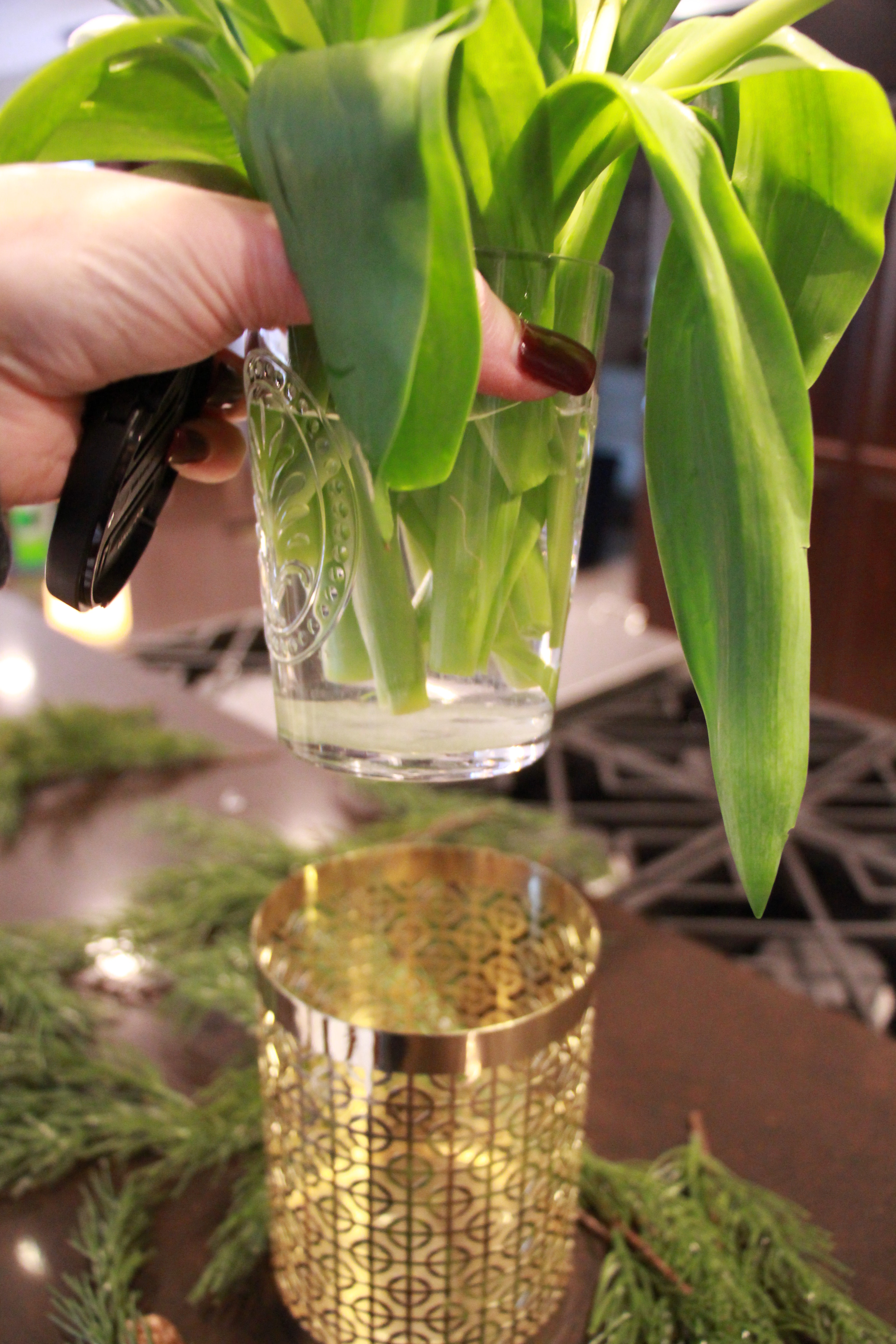 I really wanted to use this gold piece as a vase. Â Well it isn’t solid. Â I took a clear summer glass and used that as my inner vase for the tulips. You couldn’t see it in the picture, but it looked so cute in my makeshift gold vase.