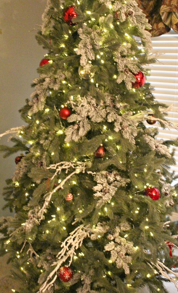If you are going to add picks and florals to your tree, you need to put those items in next. They are large items that fill in your tree. They are space fillers and they change the shape of your tree dramatically. You do not want to try to put these in after you add your delicate glass ornaments. I usually put all the fillers near each other to make a bigger impact. On this 7 1/2 foot tree you can see that I used 2 types of snowy picks. I put approximately 20 large snowy picks on the front of my tree. I do decorate the back of my trees, but not to the extent as the front. I add more picks as final fill ins when I do my vignettes in a later stage.