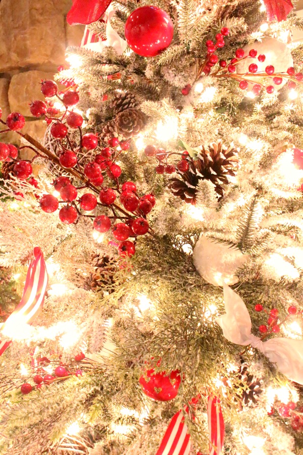 Even though the tree was a flocked white tree, I still used white picks to give the tree the look I wanted to achieve. Then I went with red berry picks and red and white ornaments. I love this red ribbon from Michaels. I’ve had it for a couple of years and I have used it in so many different ways.