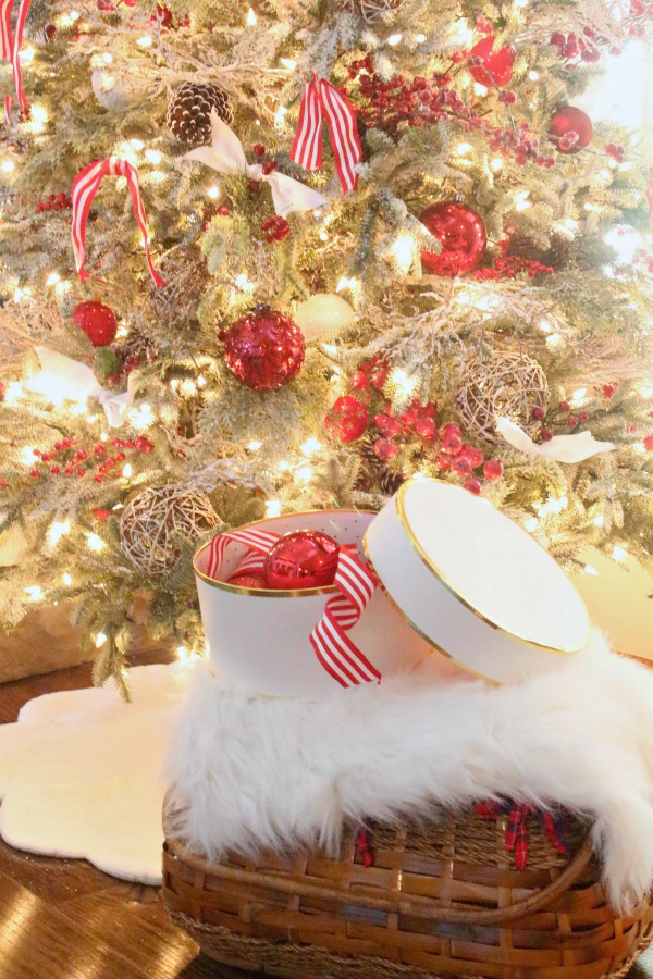 I like to decorate the bottom of the tree as well. It gives it a more styled look. I leave it like this until I am ready to put wrapped gifts under the tree.