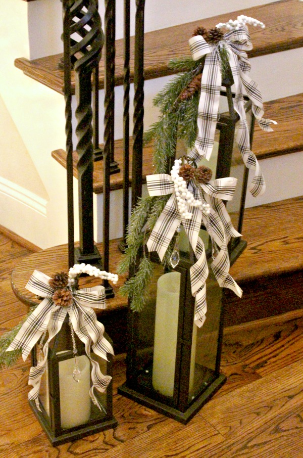 These lanterns are from Pier 1. Â I have been collecting them for years, but I know they still have them. Â I wanted to bring in the same elements from the tree and foyer so I added bows, crystals, and pinecones to the lanterns for a more finished look.