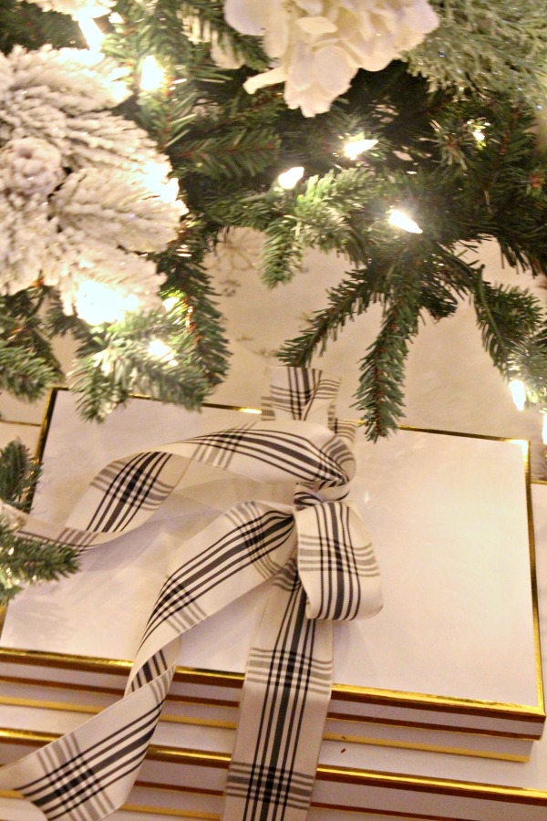 I like to decorate the bottom of the tree as well. Â It gives it a more styled look. Â I leave it like this until I am ready to put wrapped gifts under the tree.