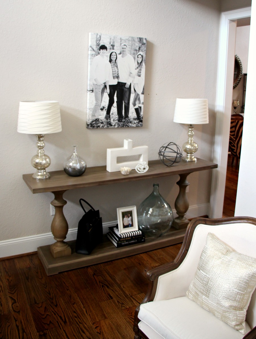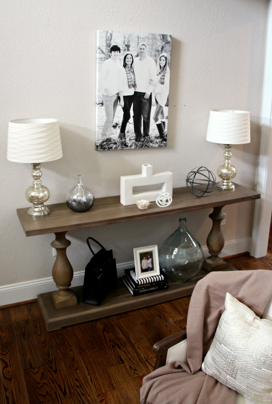 I changed the blue accessories I used here for the summer and just fell in love with this look. Â If you missed what it looked like in the summer you can see that here. Â Do you guys decorate your entryway for the different seasons?