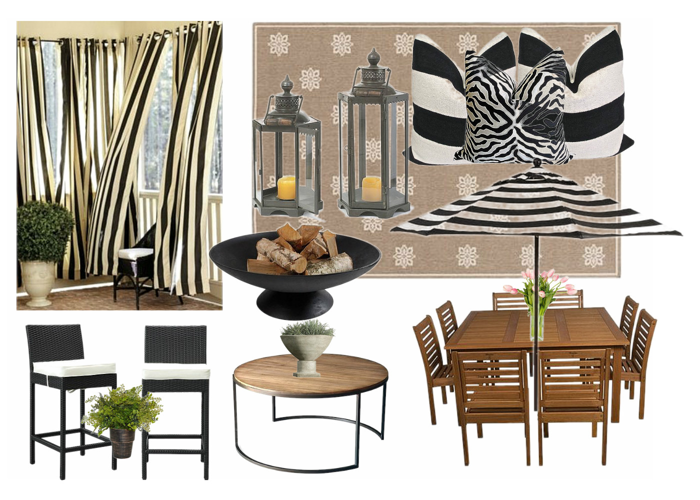 I am currently redoing our back patio and around our pool and designing an outdoor kitchen area. I’m so excited for this home update, because we really are the kind of folks that entertain more outside. My husband has clients over frequently and our two teenagers have friends over at the pool a lot. We thought it was time to take the plunge and make the back of the house what we’ve always envisioned. Here is my moodboard for my patio decor. I’m really into the resort black and white stripe for the accessories. While keeping the main pieces more neutral in beige and white.