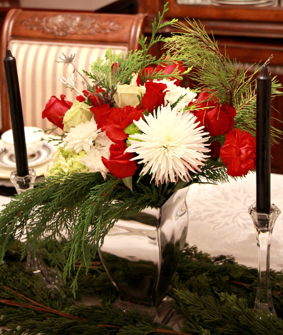 Then throwing in some red in the flower arrangement just elevates the look. Red roses always up the romance factor. If you’re looking to go from Christmas to New Year’s for a simple switch you could try a look like this. It goes from day to night very easily with slight changes but big impact.