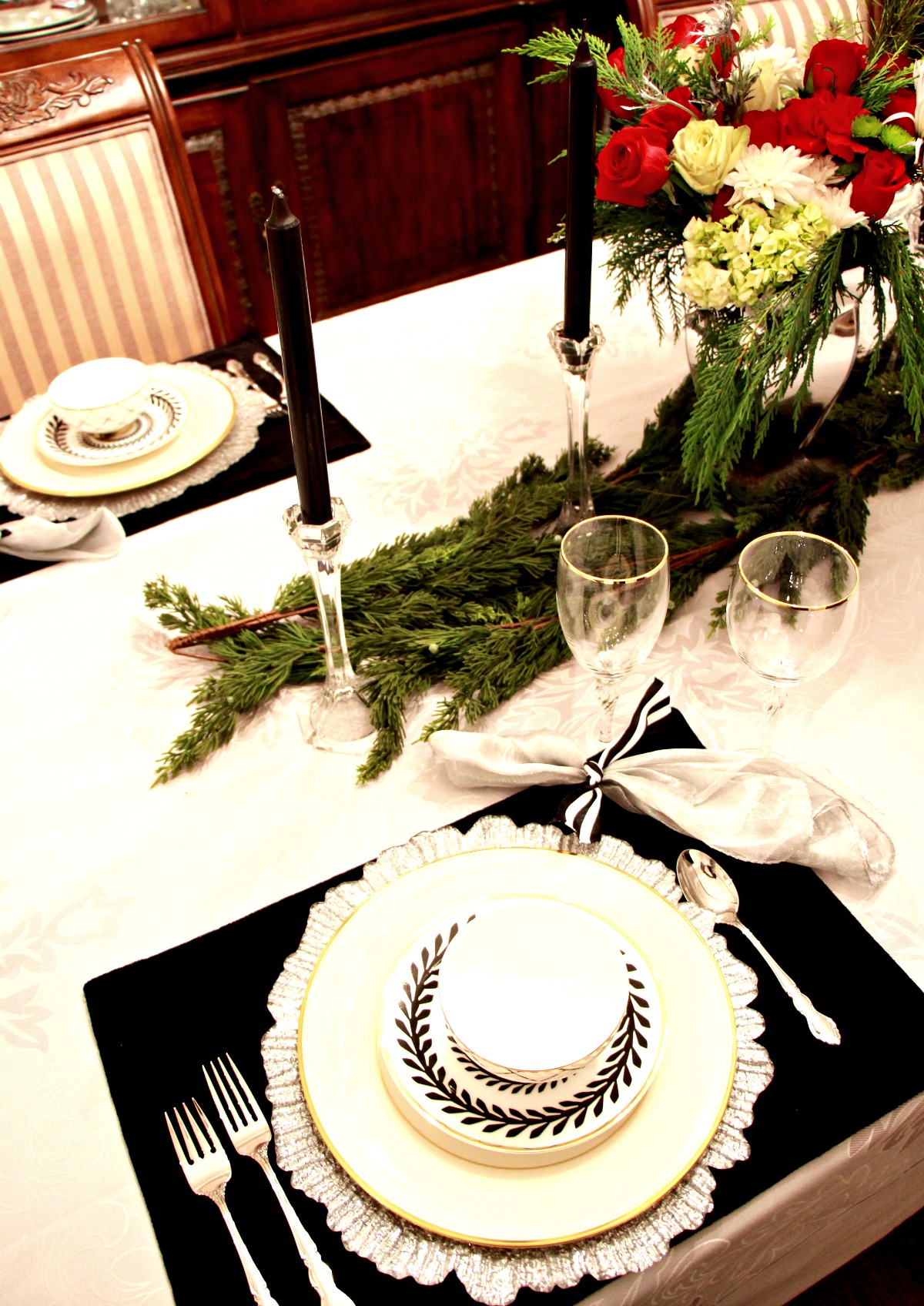 First, here is what the table looked like at Christmas. I had really showcased lots of silver and gold while using white as a base. The gray tablecloth extended my color palette so that I could use the dark gray placemats as well. The silver and gold salad plate brought the whole look together.
