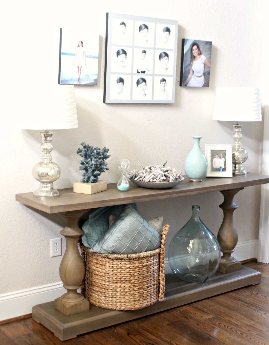 Accessories are also very important. Color comes to play again in your use of accessories. I love this blue coral and all the different shades of blue I used in this entry. The sky and the waves are all different shades of blue and it brings in those elements. Also, using shades of tan work well because of drift wood, sand, and other natural elements like shells. You can also use things that you find on the beach to put in your home.