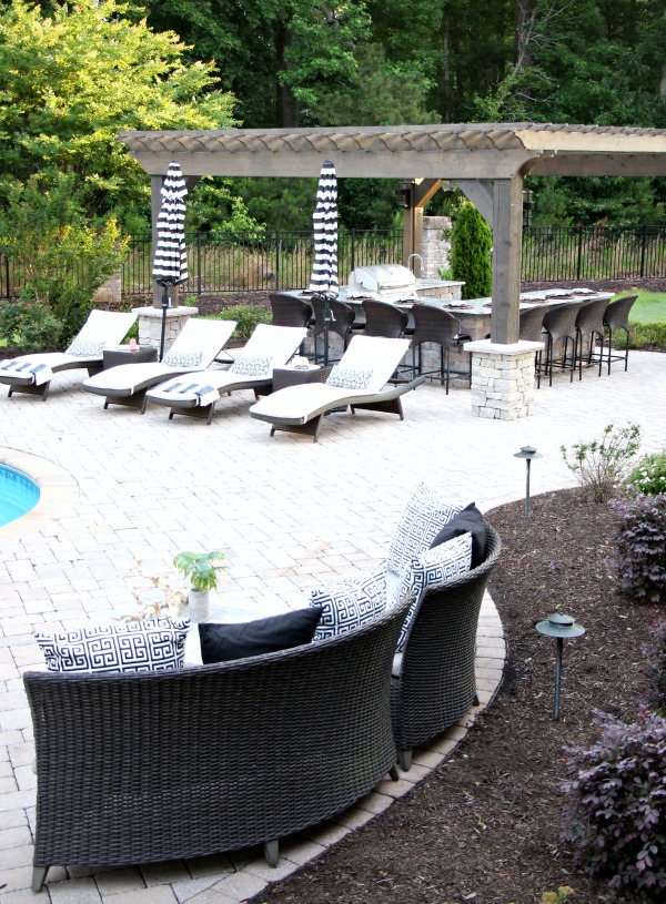 Happy Friday! Â Since my son is out for the summer I have been getting the dates and days a little messed up, but I still know when the weekends are here. I’m glad you came back today to check out the final reveal of my modern outdoor kitchen. If you missed the first part of the outdoor reveal you can check that out here. I hope you enjoy this one. Â You can definitely use it for some inspiration if you are redoing your yard or you’re just looking for a couple updates. Â You’d be amazed what a couple pillows, some flowers and an umbrella can do to a yard.