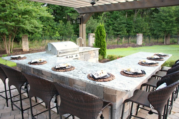 The marble on top of the fire pit and outdoor kitchen was purchased from Rock Solid in VA Beach, Virginia. Â I don’t remember the exact slab we used, but my consultant was Courtney and she is amazing. Â If you’re in the Hampton Roads area and want her contact information just let me know.