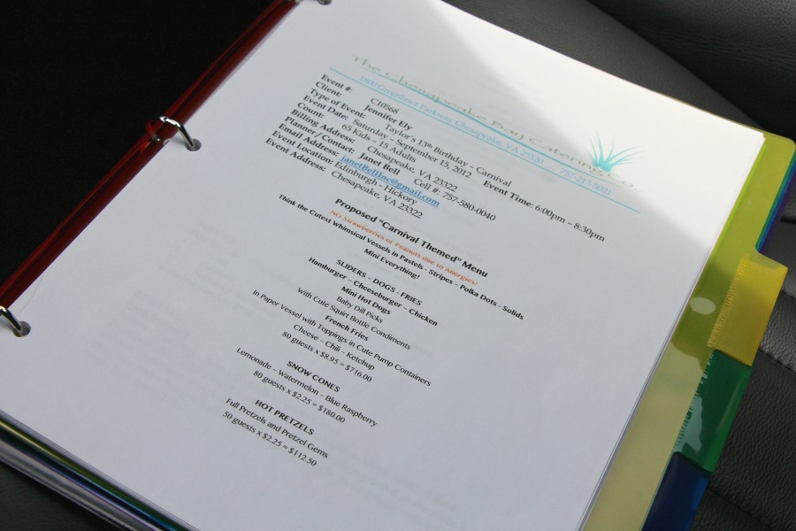 I have divided the notebook into several sections that help me organize the information I want to keep on hand. Â You can organize yours in anyway you think would help you keep track of your party information. Â You may want a section for vendor names and contacts that you deal with if you don’t have them in your phone. Below are the sections of my notebook and how I use them for future party planning. Â Feel free to use the same ones if you feel they will help you in your party planning. Â The picture below is from my daughter’s 13th carnival party.