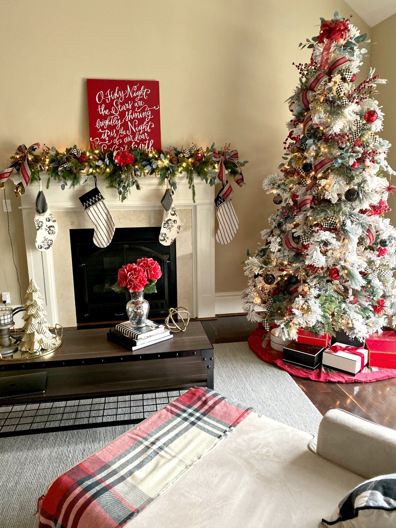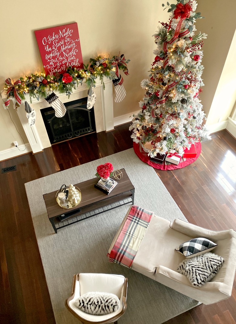 I tend to go back to the classic red . Â It just pops against the white and goes well with my home’s neutrals and metallics. Â It also photographs really well so I knew it would look great for you guys on the blog. Â You can do so much with it because it really is versatile. Â Last year, I used red and white in a client’s office. I loved it so much I knew I would do red in my home again in 2019. Â You can check that post out here. Â One year I did the red and Burberry ribbon which I loved. I also did the red and buffalo check which still gets my largest amounts of views. Â There are so many things you can do if you have a good collection of base ornaments. Â You can just change out your ribbon and you get a totally different looking tree.