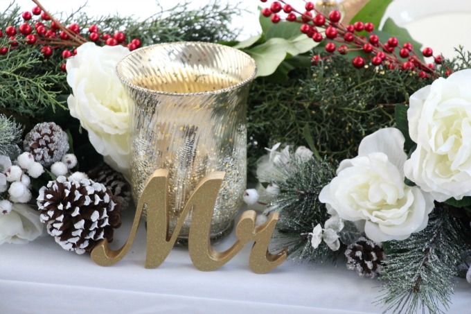 I really wanted the bride and groom’s table to be special. I wanted it to stand out and be totally different than any other space I decorated. I loved the way it turned out. I started with a wedding Garland. In the next post, I will explain all about the garland and where you can purchase that from. I then filled in with white artificial flowers from Michaels. The gold vases were also from Michaels. I finished this table off with some pinecones and the gold Mr. & Mrs. letters. I used my Lenox Eternal china as their table setting which is trimmed in gold. You can check out other posts where I used that China here and here.