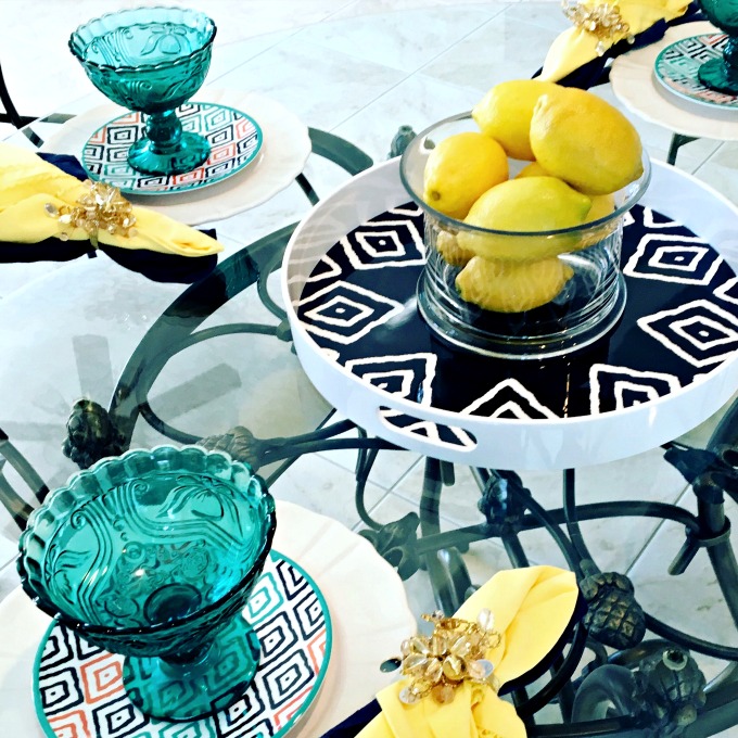 I used a mix of dishes from Target, Pier 1, and Pottery Barn. It is amazing how you can gather things from so many different stores and collections and they can go together as if you purchased them as a set. First, I worked on her kitchen table. Tablescapes are my absolute favorite things to decorate. I always keep my dining room table decorated depending on the season or holiday. With all the blue and yellow I chose to have a centerpiece of real lemons to tie in my accent color. I love decorating with lemons and limes.