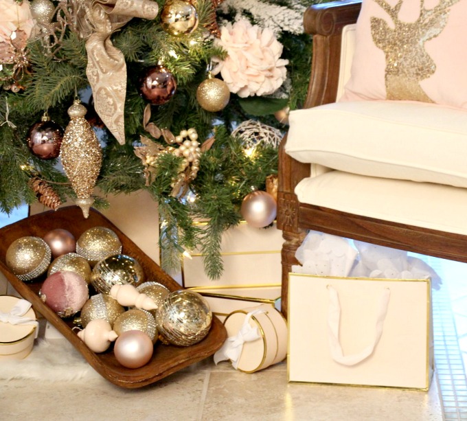 Add color with designer ribbon- Ribbon can be a game changer for your tree.  You can find this in any theme and color that you’re looking for.  Weaving ribbon in and out can take a special technique.  You don’t want to make it look like you just circled around the tree and wrapped the ribbon around and around and around. Here is a post I did last year showing the full decorating of all my trees.  And if you’re not already reading Kristen’s blog Ella Clare Inspired, you need to head over there and read her post on using ribbon on your Christmas Tree. For an 8 foot tree you want to buy at least 4 rolls of ribbon that are 10 yards long. This way you have enough to use on packages at the base of your tree.