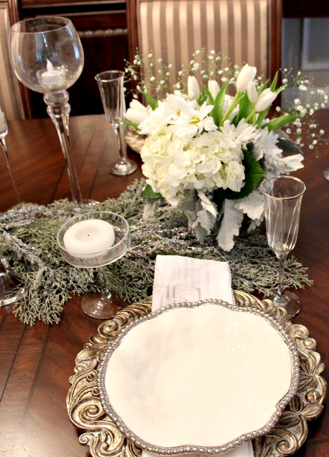 As you saw in the Christmas post, I used the same greenery, white artificial flowers, as well as the same chargers. However, this table took on a completely different look.