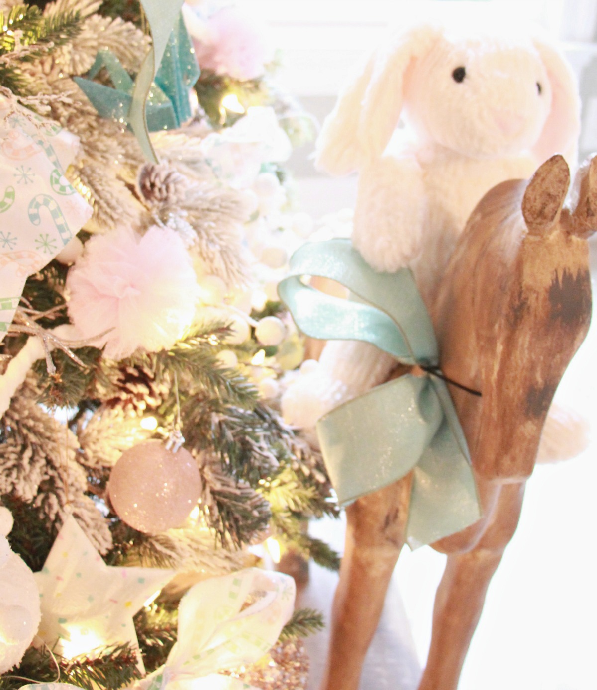 I appropriately named this my sugar plum fairy tree. Â I did the tree in pastels, but the main color is pink. Â I just love the Pom Pom garland. Â It reminds me of a tutu ballerinas would wear. Â The ribbons are a perfect match. Â They have pastel candy canes on them. Â I got it from At Home. Â Actually all the “fun” pastel ornaments I got from At Home too. Â The mint and pink ornaments were my own. Â I already had the majority of the stuff for this tree. Â I added about 25% of “speciality” ornaments and ribbon to give it some pizazz.