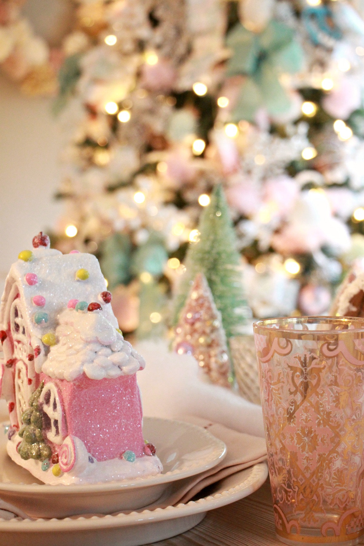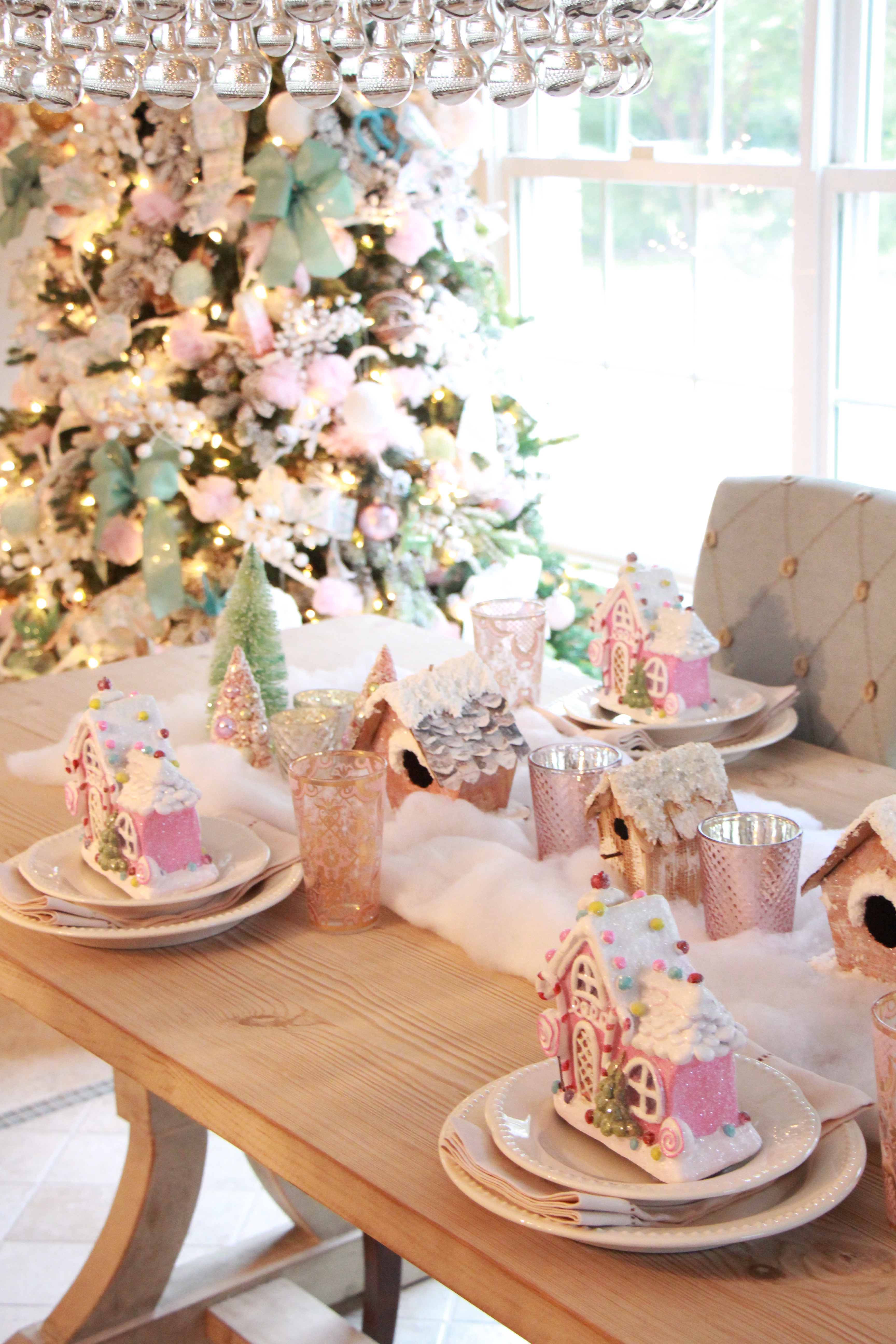 I love this table design.  It just screams sugar plum fairy doesn’t it?  I got the pink gingerbread houses from Hobby Lobby. The white dishes are Emma from Pottery Barn and so are the pink napkins.